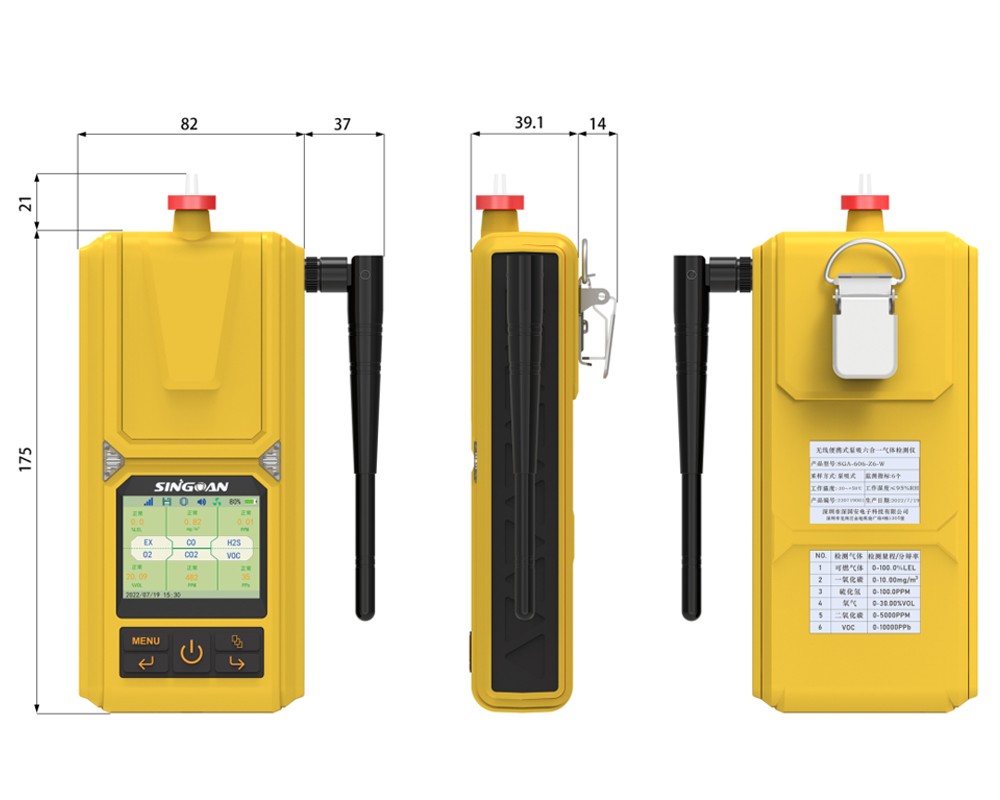 SGA-606系列便攜式六合一氣體檢測儀小巧輕便,功能強大。2.4英寸高清液晶彩屏,實時顯示檢測目標氣體濃度值;內置高性能采樣泵,1-10檔流速可調;5000mA超大容量鋰電池,可連續工作20小時以上;內置全生命周期監控系統,傳感器壽命到期、儀表故障、校準提醒,零點自動修正等一應俱全,還可一鍵復位恢復出廠設置;中文簡體、英文、中文繁體三種語言系統,適合所有人群操作。umol/mol、ppm、ppb、%LEL、%VOL、mg/m3、ug/m3、g/m3、mg/l、g/l等濃度單位之間自由切換,氣體濃度值一目了然;支持本地存儲10萬條以上數據,數據存儲間隔時間1-600秒可調。數據可通過儀器自帶的專用軟件通過USB進行導出Excel表格,并可進行打印、存儲等。也可選配物聯網平臺,實現數據的無線傳輸,可將監測數據上傳至物聯網平臺,添加一個/多個聯系人,實現手機APP、小程序、PC端的實時查看,當目標氣體濃度超標時檢測儀除了會自動進行報警外,還可通過電話、短信、郵箱等方式進行一人/多人報警,第一時間發送報警信息;智能光感控制功能,可根據當前光照度自動調節屏幕亮度;產品體積小、重量輕,采用人體工程學設計單手可握。也可選配鱷魚夾、掛繩等進行腰掛;防跌倒功能,如發生意外跌倒,檢測儀則會持續進行報警,提醒其他工作人員。特別適合進入隧道、管廊、地窖、污水池、下水道、煤礦等場所的工作人員使用;針對粉塵濃度高的環境,可選用粉塵專用過濾器,有效過濾粉塵等雜質,更好的檢測目標氣體;